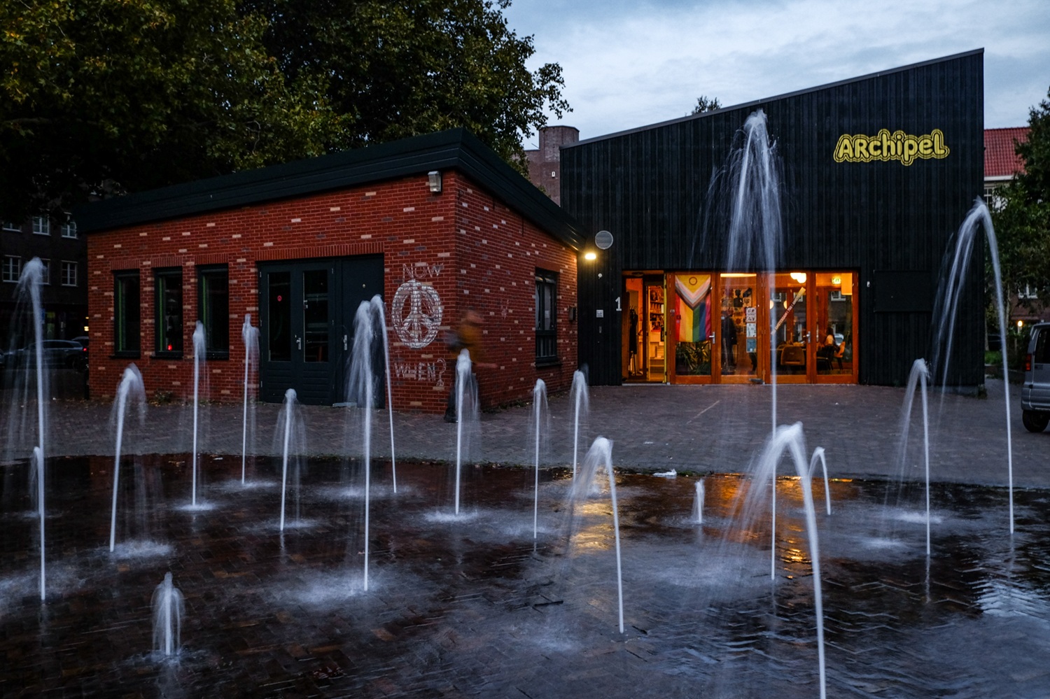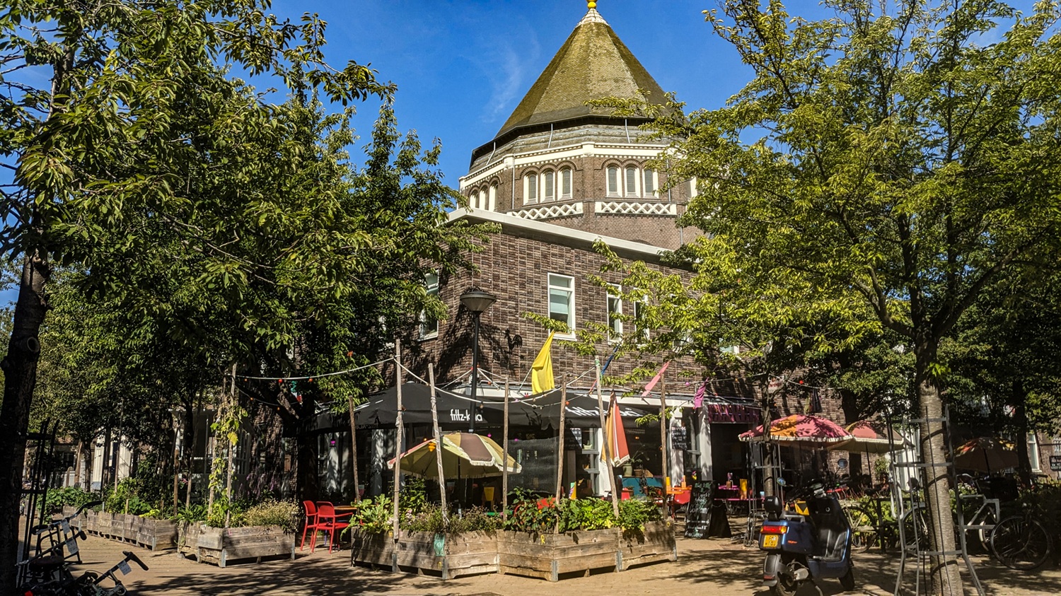 Binnen kregen de gebruikers zelf de ruimte om de sfeer te bepalen. De muren zijn bekleed met kleurrijke tegels, de vloeren met dikke tapijten, en op de plafonds zijn blauwe cirkels geschilderd – een herinnering aan de koepels van klassieke moskeeën. De bakstenen gevel speelt met kleur, richting en reliëf, waardoor het gebouw tegelijk modern en vertrouwd oogt: een stille dialoog tussen twee bouwculturen in het hart van Amsterdam Oost.