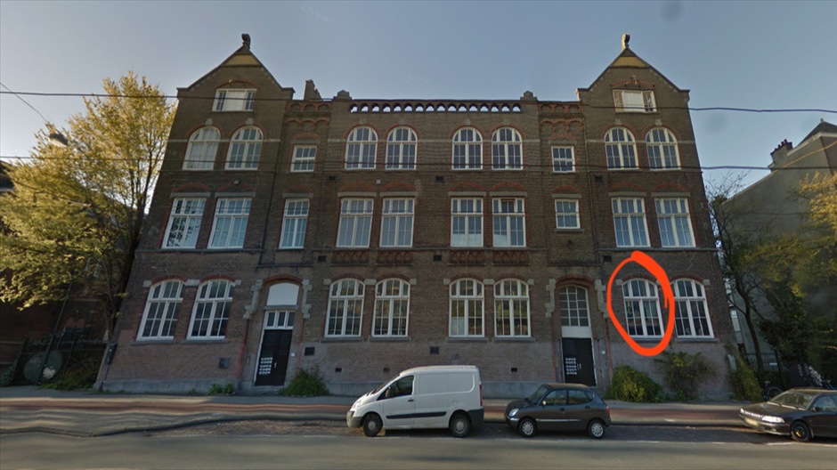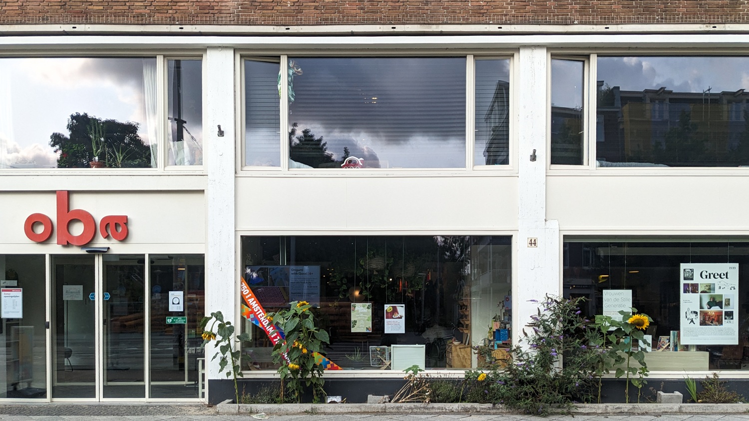 Kunstenaarsinitiatief van collega-kunstenaar Su Tomesen aan de Zeeburgerdijk 25, achter het raam van haar studio in atelierpand Zeeburgerdijk Artists' Studios.