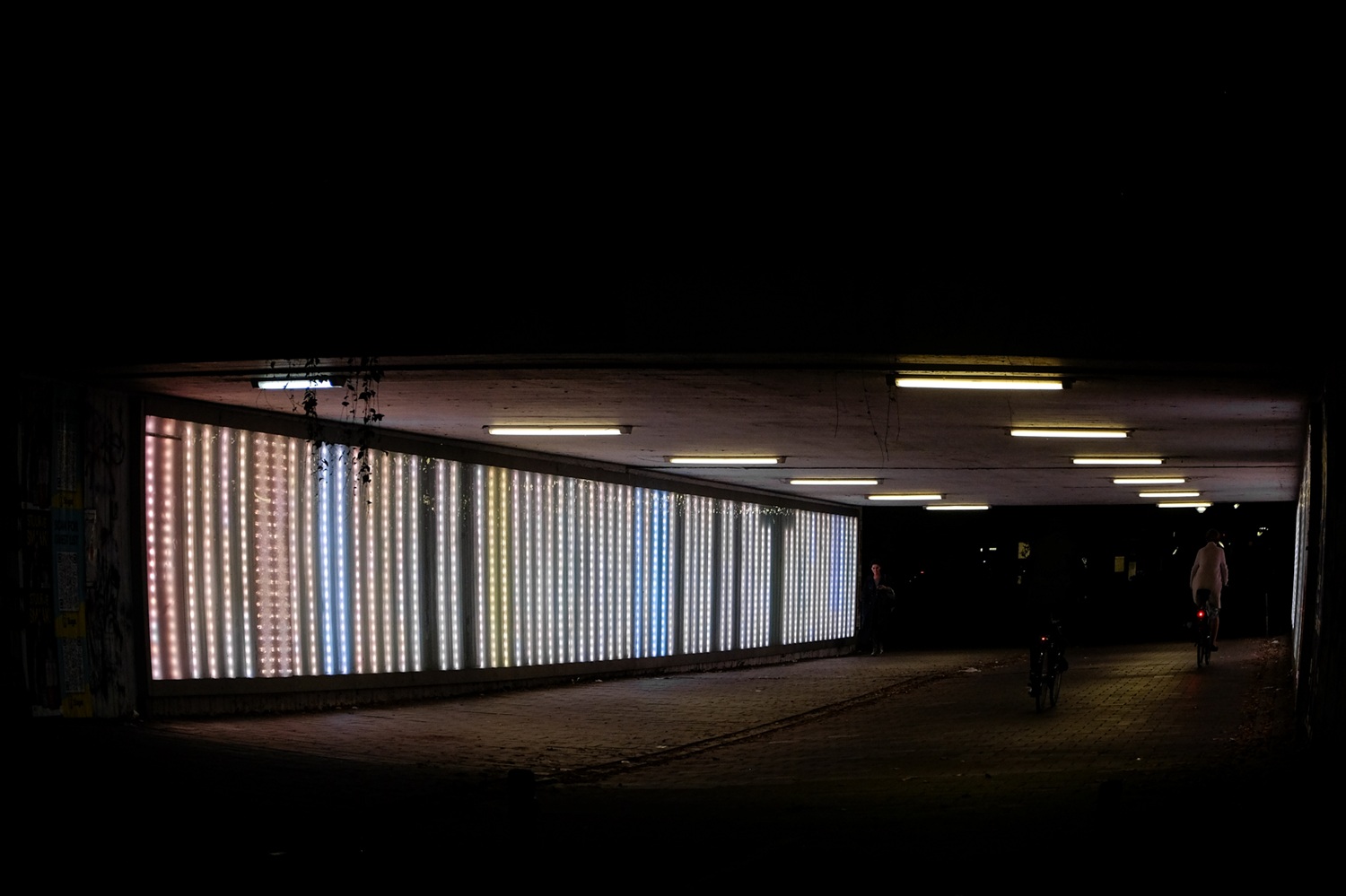 About: Hoe verander je een tunnel in een kunstwerk? In de Tugelaweg-tunnel worden licht en schaduw gebruikt om een onverwachte, bijna dromerige ervaring te creëren. De lange, rechte doorgang wordt getransformeerd tot een plek waar bezoekers even in een andere wereld lijken te stappen. De wanden – normaal gesproken grijs en anoniem – worden als grote vensters gebruikt, waarin subtiele bewegingen en silhouetten te zien zijn.